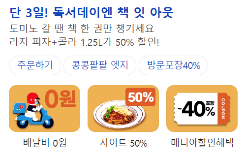 도미노피자는 독서의 계절을 맞아 책을 지참하는 고객에게 50% 할인 혜택▶▶을 제공하는 독서데이 이벤트를 진행합니다.