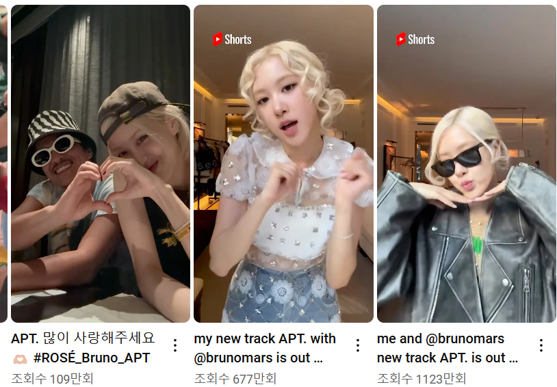 로제와 브루노 마스의 로제 아파트는 발매 직후 세계 주류 시장에서 큰 반향을 일으키며, 스포티파이 미국 차트 1위를 기록하고 영국 오피셜 싱글 차트에서도 4위에 올랐습니다. - 로제 아파트 뮤직비디오는 발매 5일 만에 조회수 1억회를 돌파했으며, 이로 인해 로제 아파트가 국내에서도 10대부터 50대 이상까지 모든 세대에서 큰 인기를 얻고 있습니다.