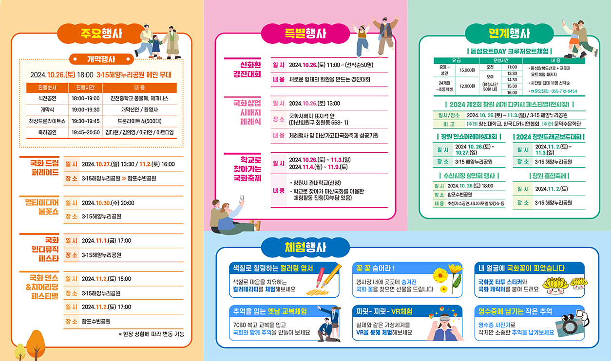마산가고파국화축제는 국화의 아름다움과 다양한 공연, 체험 프로그램을 즐길 수 있는 축제입니다.