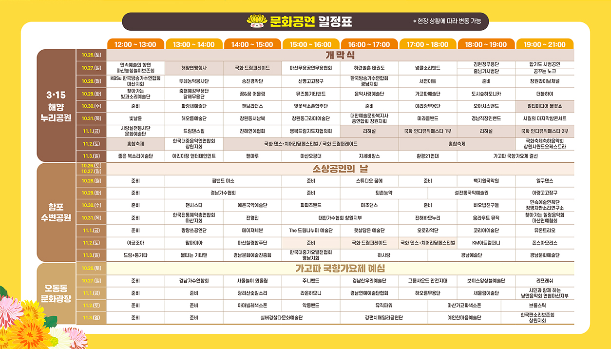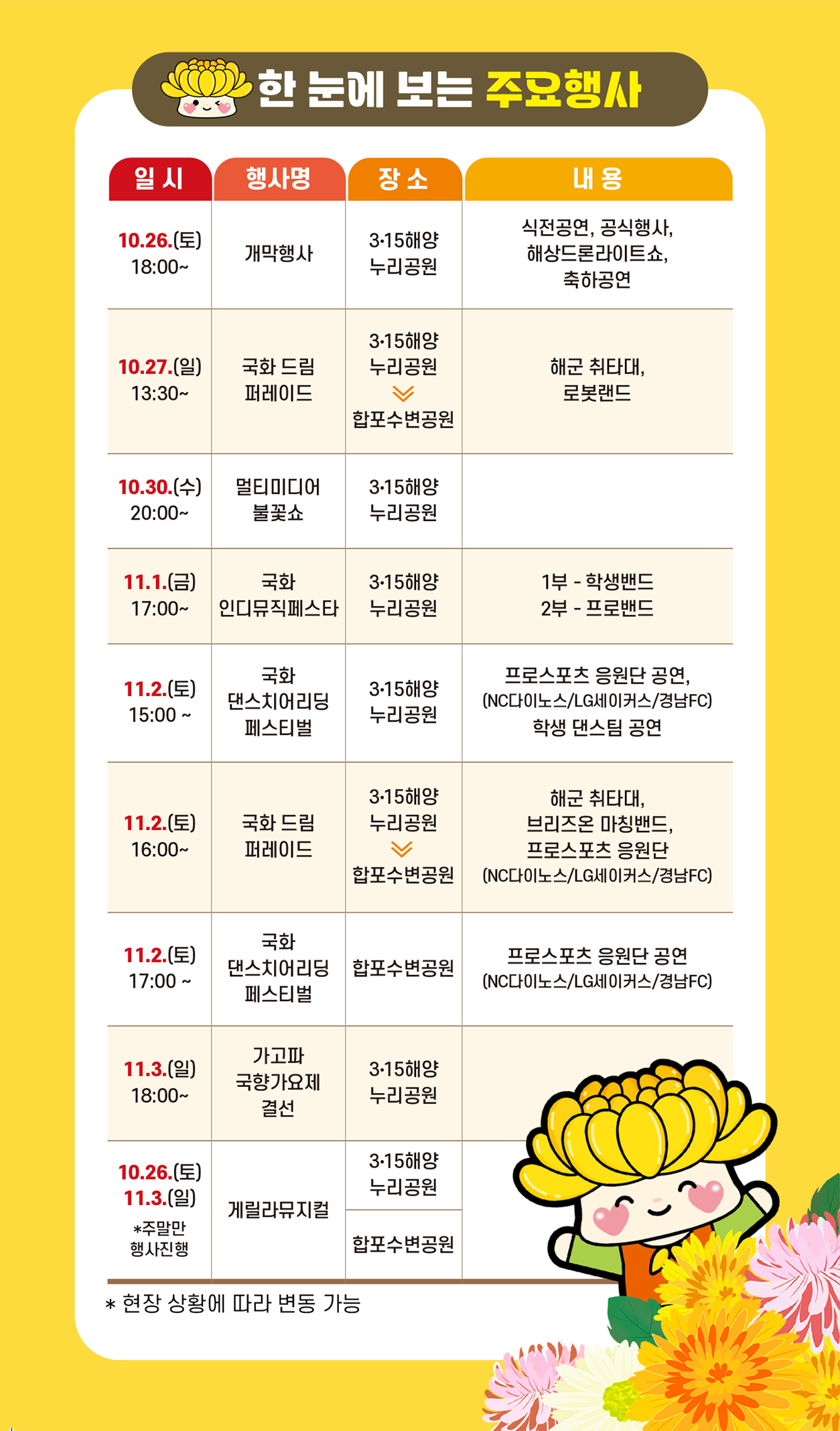 - 개막식: 10월 26일 오후 6시, 드론 라이트쇼 및 축하 공연