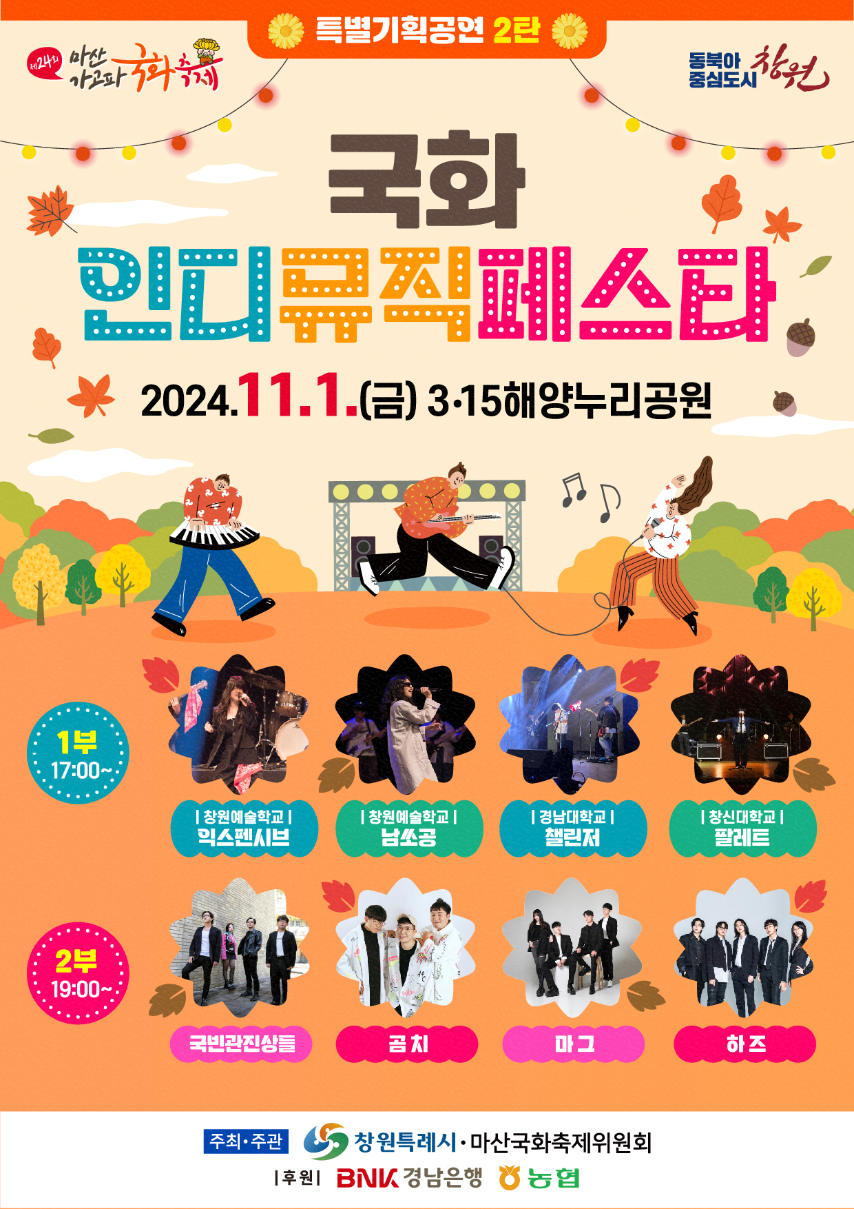 - 지역 인디밴드: 국화 인디뮤직 페스타에서는 국빈관진상들, 마그, 곰치 등 인기 인디밴드들이 참여해 특별한 무대를 선보입니다.