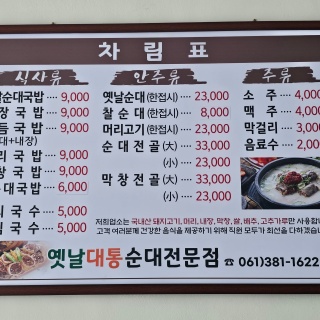 옛날순대국밥 | 9,500원 | 순대+공기밥+배추김치+깍두기+들깨가루+새우젓 등 구성 풍부 |