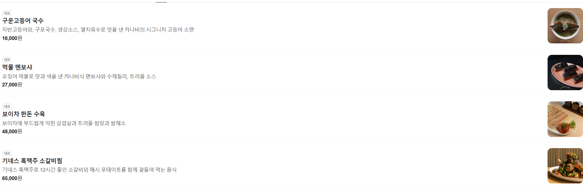 📌 기네스 흑맥주 소갈비찜 65,000원, 한우 타르타르 55,000원, 매콤 새우 잡채 24,000원 등이 있습니다.