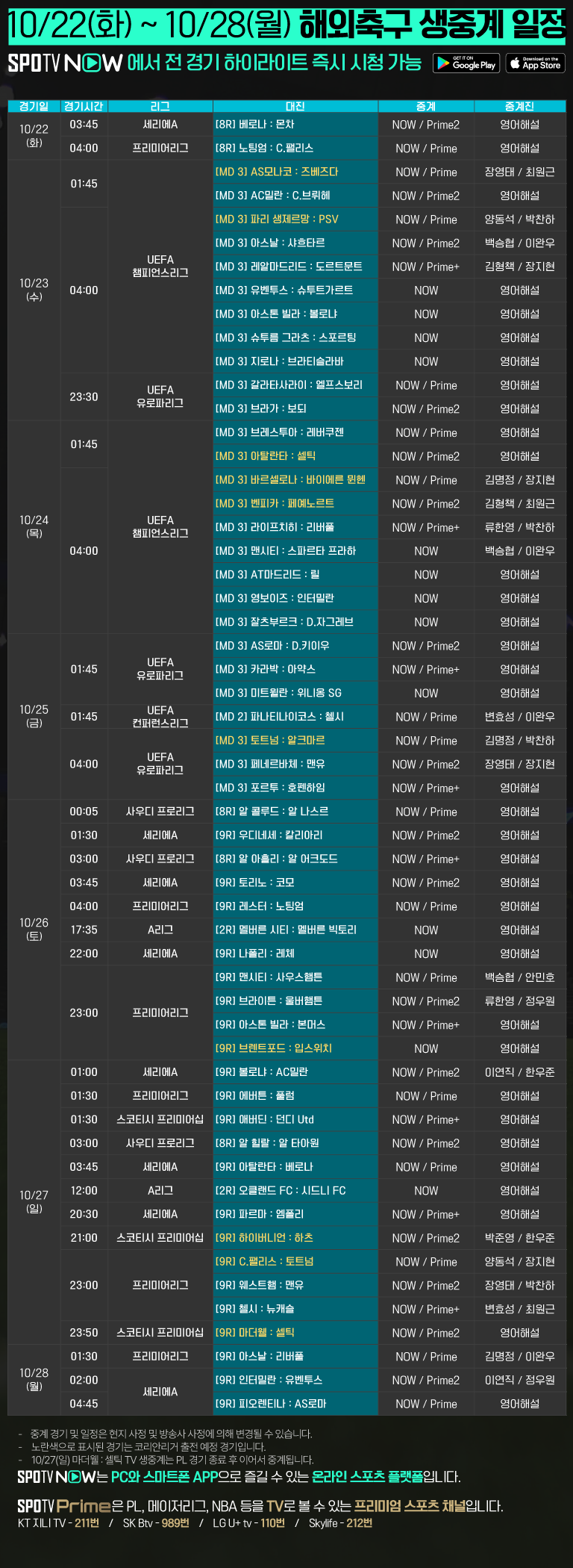 SPOTV Prime과 SPOTV NOW를 통해 생중계▶▶를 시청하고, 이벤트 참여 기회도 놓치지 마세요.