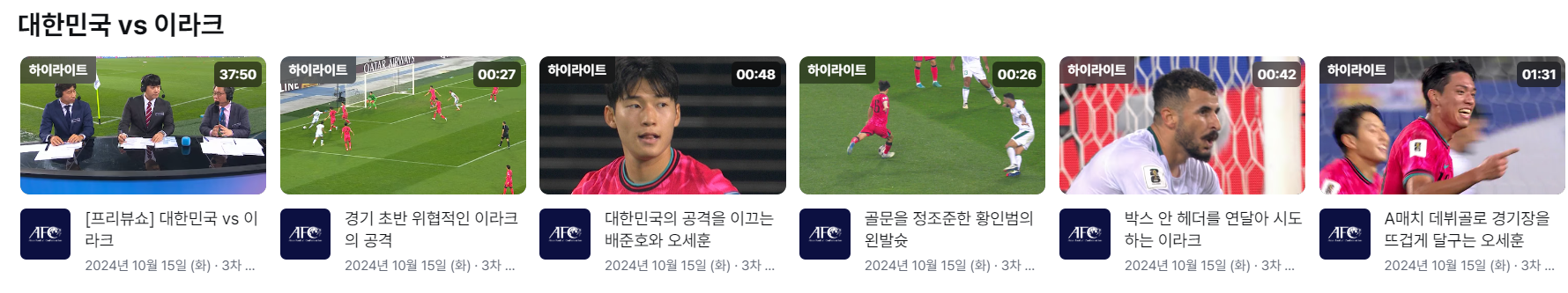 2024년 10월 15일 대한민국과 이라크의 월드컵 예선전 하이라이트를 시간 순서대로 정리하면 다음과 같습니다: