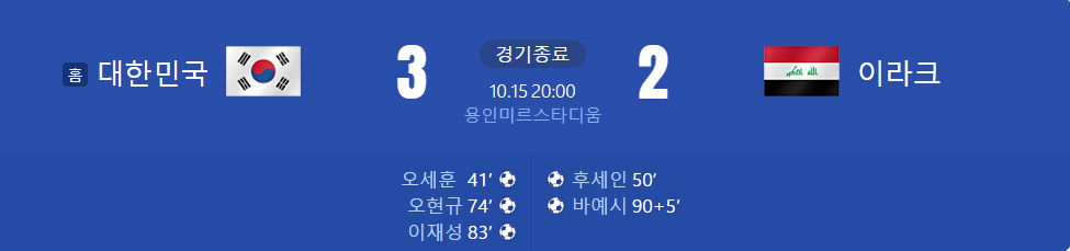 - 후반 추가시간 (90+5분): 이라크의 이브라힘 바예쉬가 만회골을 넣었지만, 결국 경기는 3-2로 대한민국의 승리로 끝났습니다.