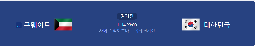 2024년 11월 14일 오후 11시에 쿠웨이트 vs 대한민국 월드컵 예선 경기가 진행되며, 쿠팡플레이를 통해 시청할 수 있습니다.