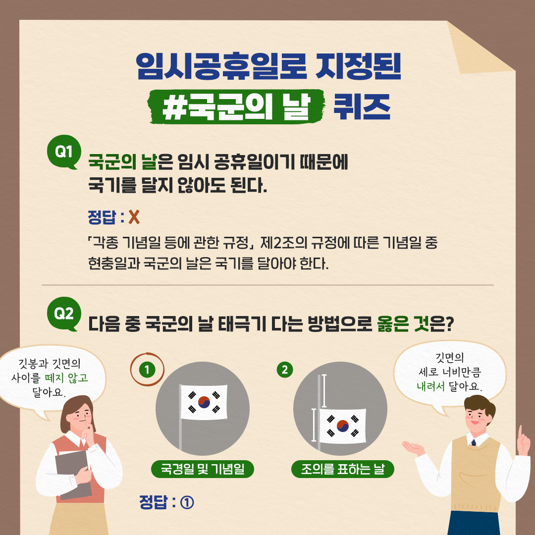 국군의 날(10월 1일)은 대한민국 국군의 창설을 기념하여, 군인들의 헌신을 기리기 위해 태극기를 답니다.