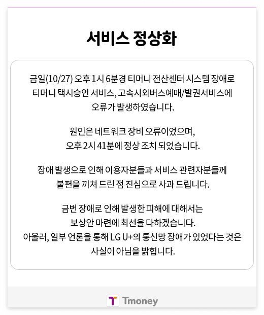 이번 티머니 전산망 오류로 인해 많은 분들이 불편을 겪으셨습니다.