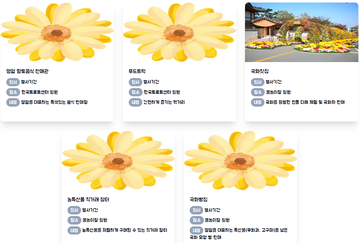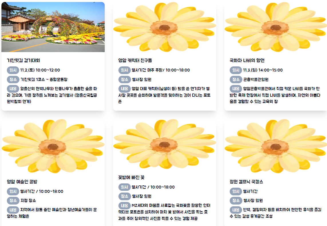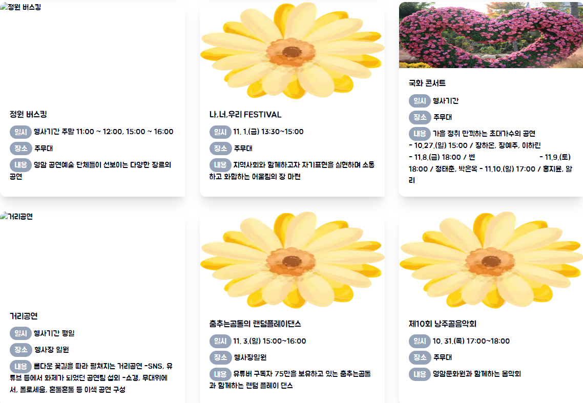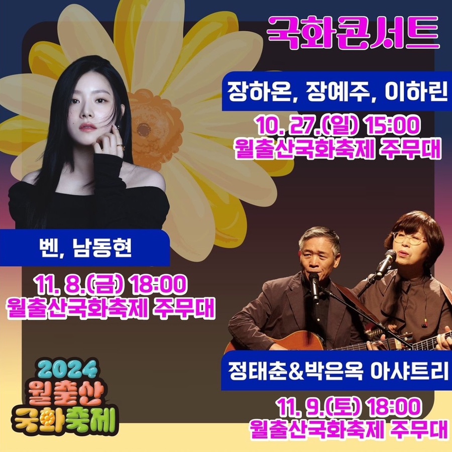 낮에는 국화의 아름다움을 감상하고, 밤에는 초대가수들의 콘서트와 함께 잊지 못할 가을을 즐겨보세요.