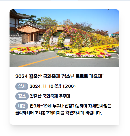 국화 향기가 가득한 축제와 함께하는 청소년 트로트 가요제에 많은 관심과 참여 부탁드립니다.