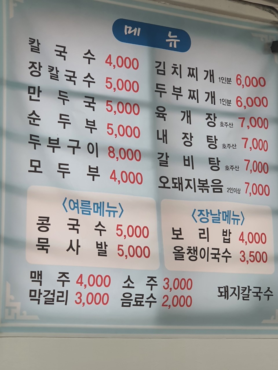- 칼국수: 4,000원